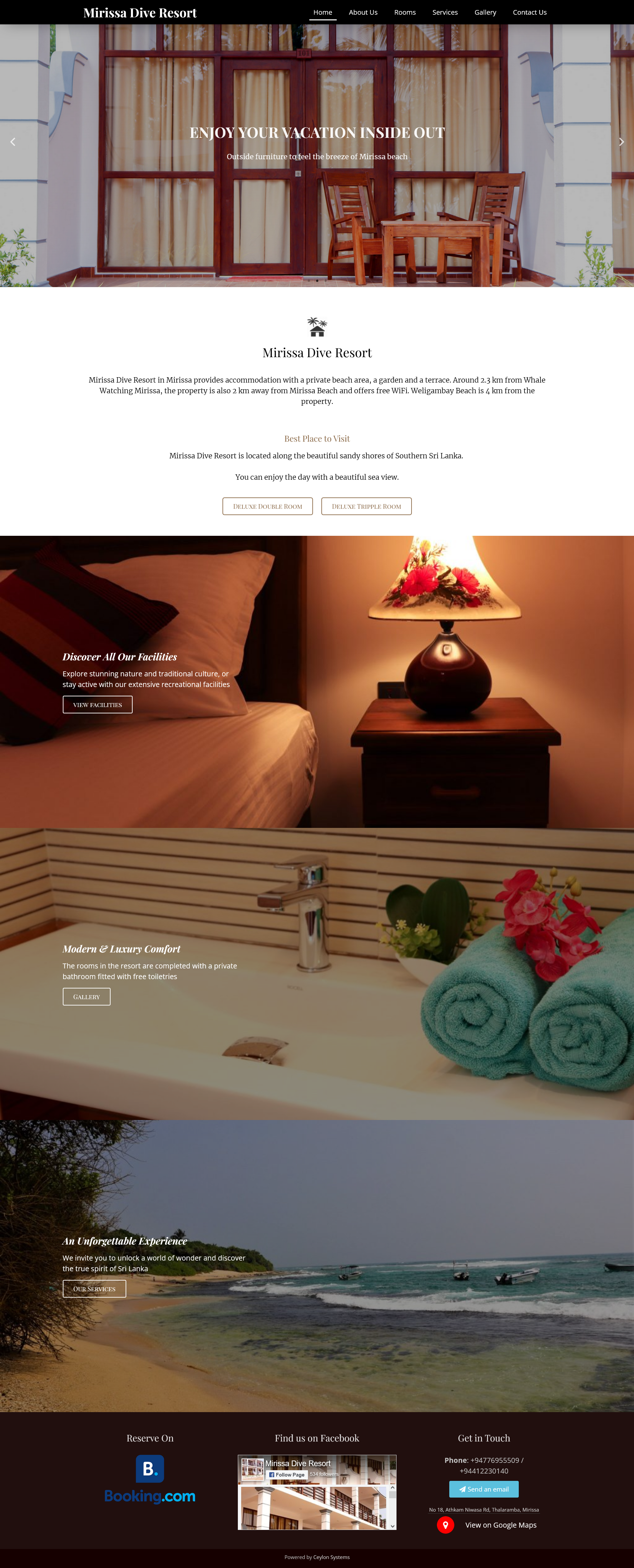 We designed and developed a website that functions as a virtual portal to Mirissa Divers Resort. The design expresses the resort's specific charm, highlighting its accommodations, facilities, and the beauty of Mirissa's coastal scenery.
